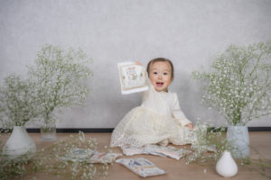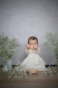 お子様の名前と縁のある「カスミソウ」に囲まれて、自由に、ナチュラルに撮影。