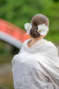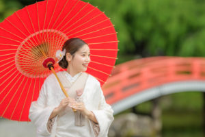 和装の良さを引き立てるロケーションとアイテムで、“結婚”らしいショットも。
