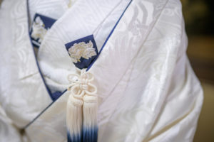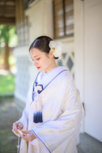 紺色のふき(白無垢の襟や袖部分のふち)が印象的で、新婦さんの落ち着いた雰囲気ぴったりですよね。
