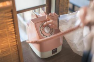 昔ながらのダイヤル式電話機で、電話をかけるお茶目なワンシーンも。
