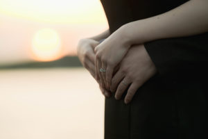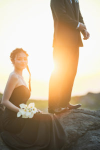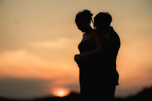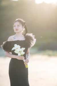 夕陽が沈む海をバックに、水面に反射する光に包まれたお二人の姿は、息を呑む美しさでした。