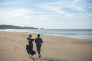 まるで映画のワンシーンのように、浜辺を歩くお二人のショットも。