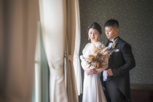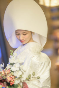 アソベの森 いわき荘では、綿帽子とブーケでトレンド感のあるスタイリングに。