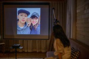 OTTABIOのリビングルームに新婦さんを呼び出し、いよいよサプライズムービーを上映。