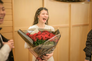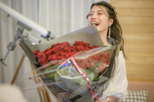 ムービーが終わるとバラの花束を持った新郎さんが登場し、新婦さんのもとへ…