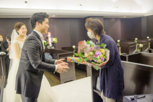 想いをのせたレターセレモニーのあとは、ご両親へ花束と記念品をプレゼントし「ご家族だけのプチ結婚式」は終盤へ。