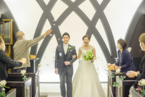 結婚式のようにバージンロードを歩き、退場するお二人をフラワーシャワーで祝福。